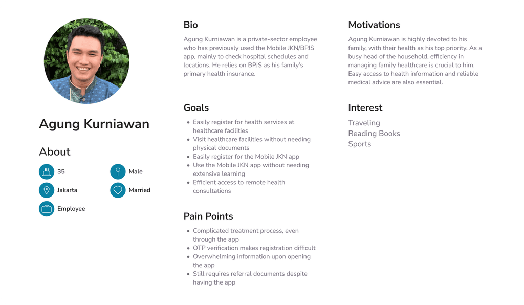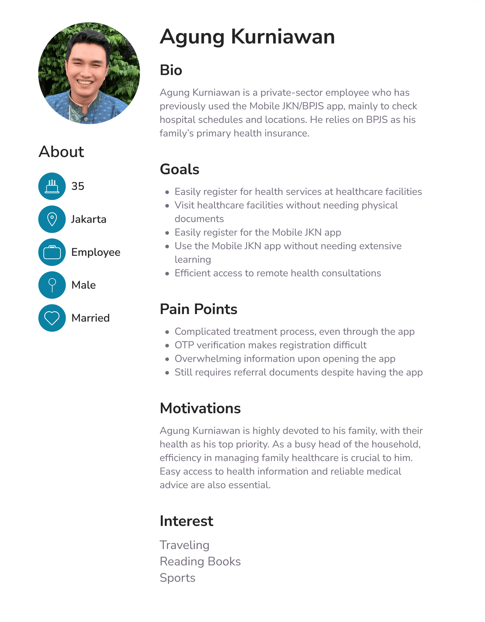 After conducting research, we created a user persona based on the collected data. This user persona helps us visualize the target user of the Mobile JKN app and assists in developing solutions for the identified issues.