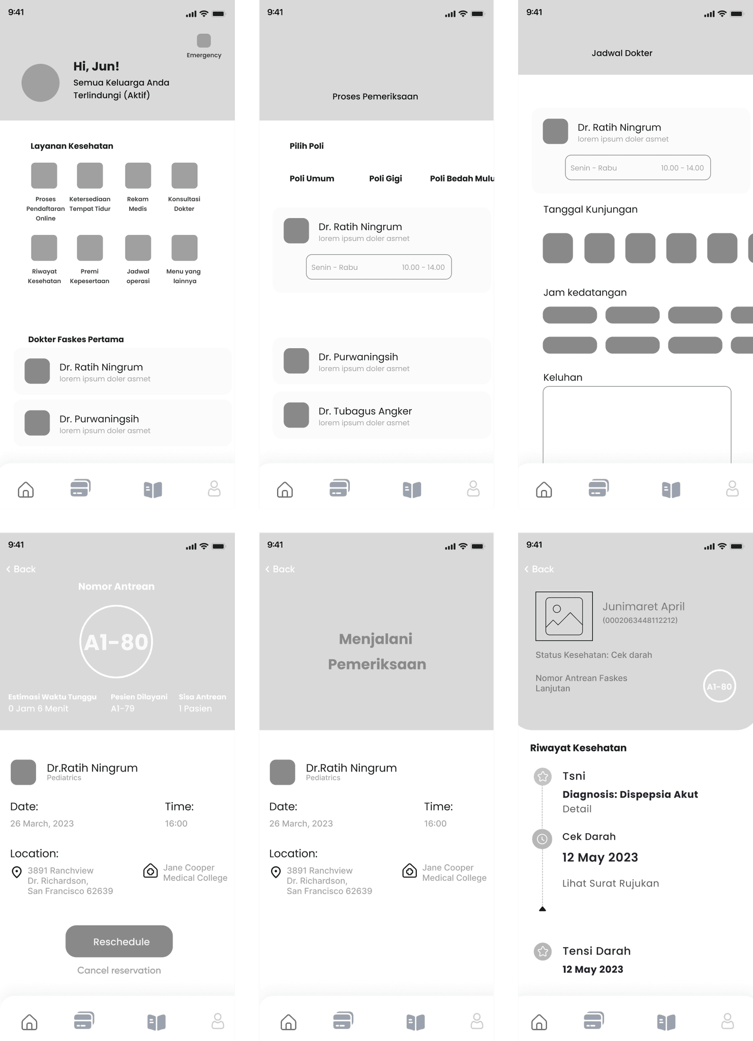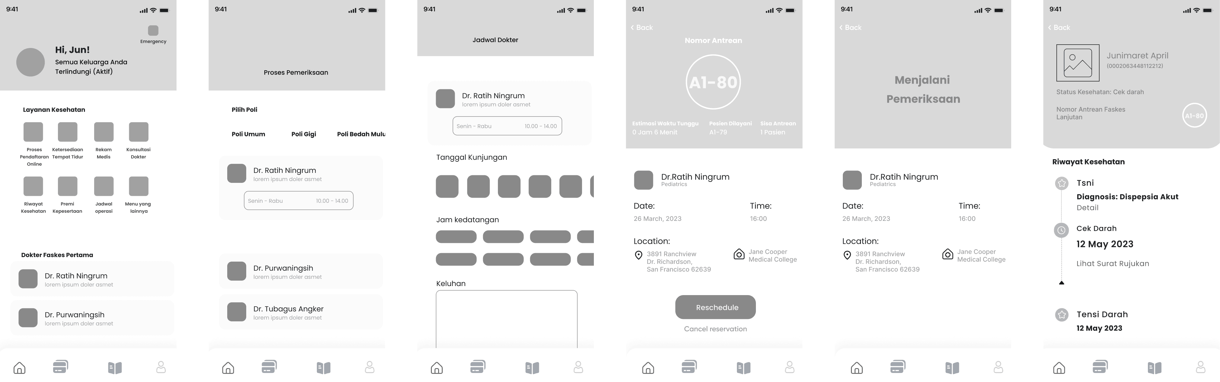 After defining the user flow, we created a wire flow, which we then finalized into a mockup prototype. In this wire flow, we redesigned the existing layout, making the revamped feature the main feature on the homepage so that users can easily find it. We also added a track record system, allowing users to view each step of their treatment process—from queue number registration to examinations at both primary and secondary hospitals. We named this revamped feature the Online Registration Process (Proses Pendaftaran Online).
