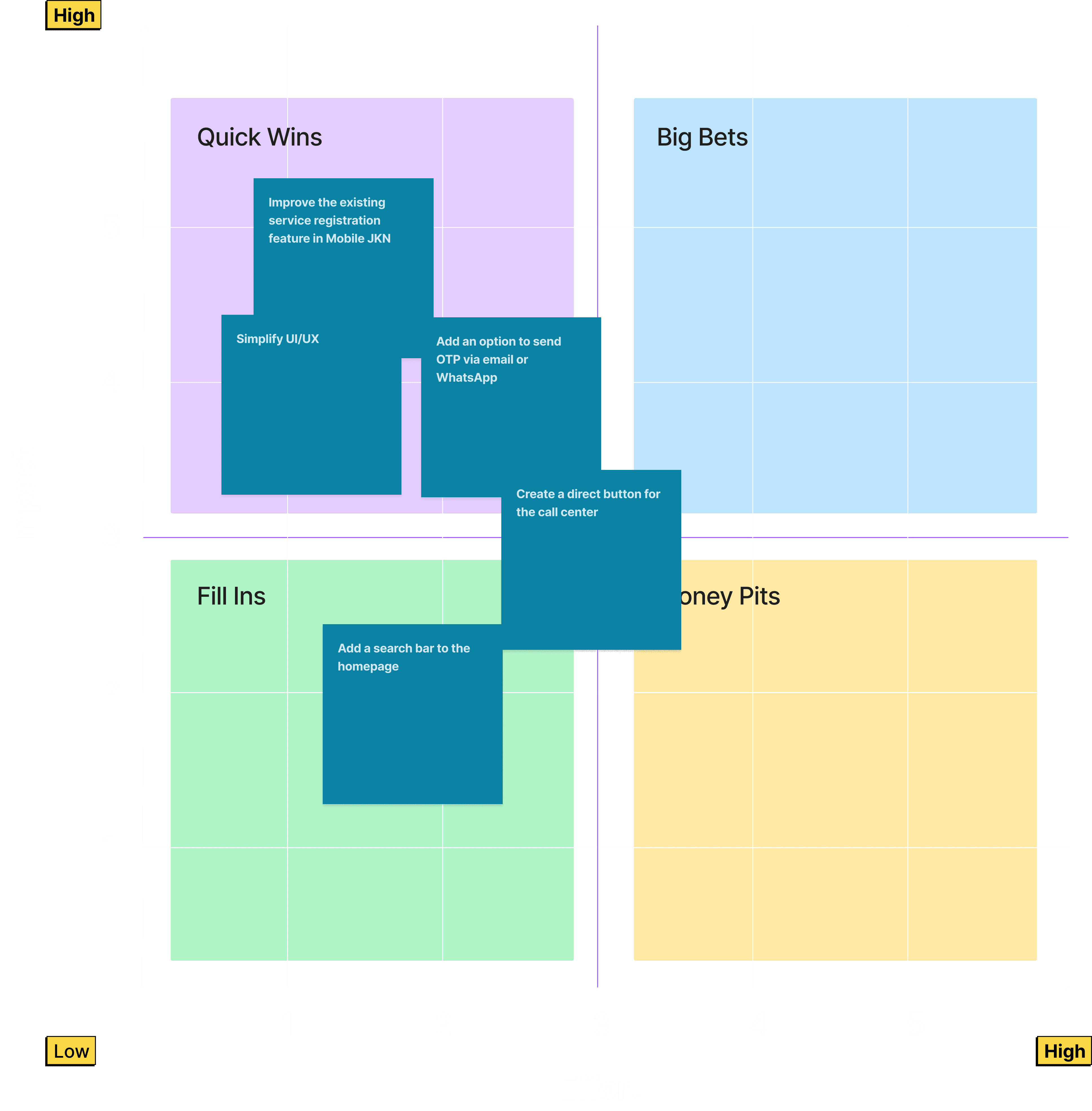As shown in the priority matrix above, the solution we chose to implement is the improvement of the existing Service Registration (Pendaftaran Pelayanan) feature in Mobile JKN. This solution was selected as it is the most feasible within the given timeline and is also the most needed by users.