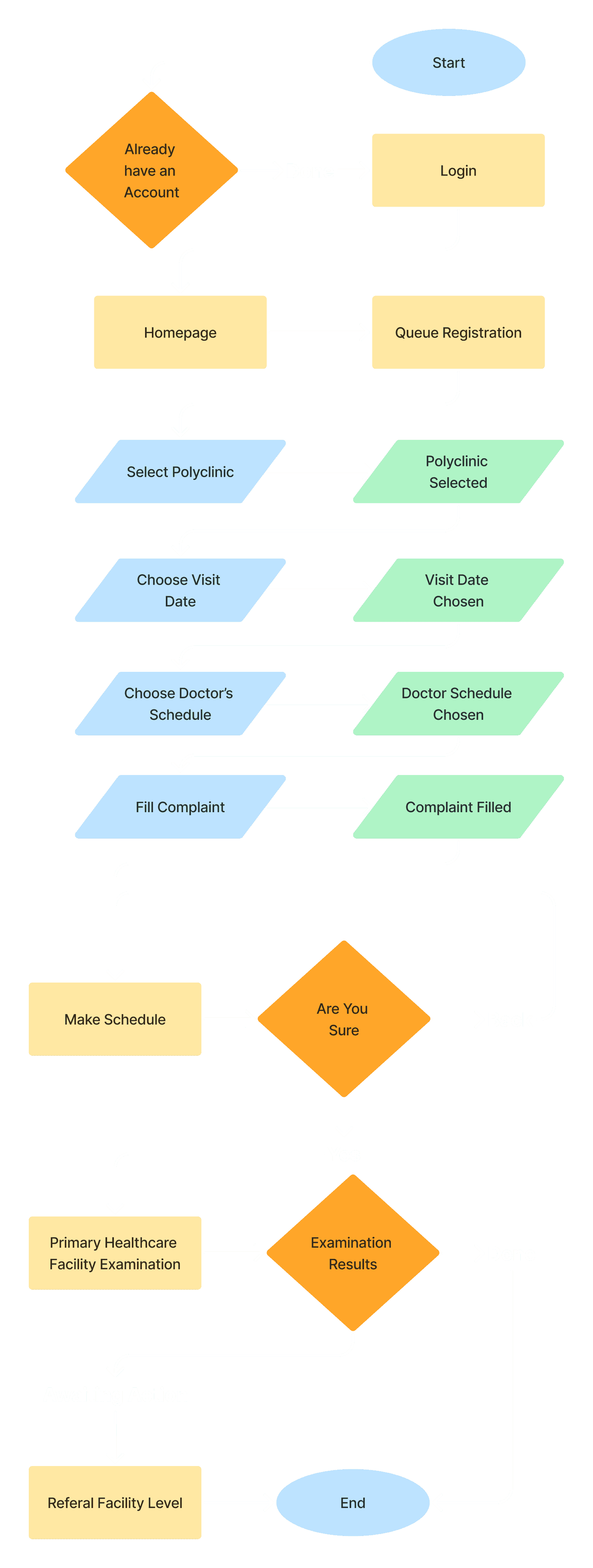 In the initial stage of creating a new feature, we first developed a user flow. This flow maps out the steps users go through when accessing the revamped feature. This feature is quite similar to the existing Service Registration (Pendaftaran Pelayanan) feature, with the main difference being the addition of a track record for the patient’s examination process.